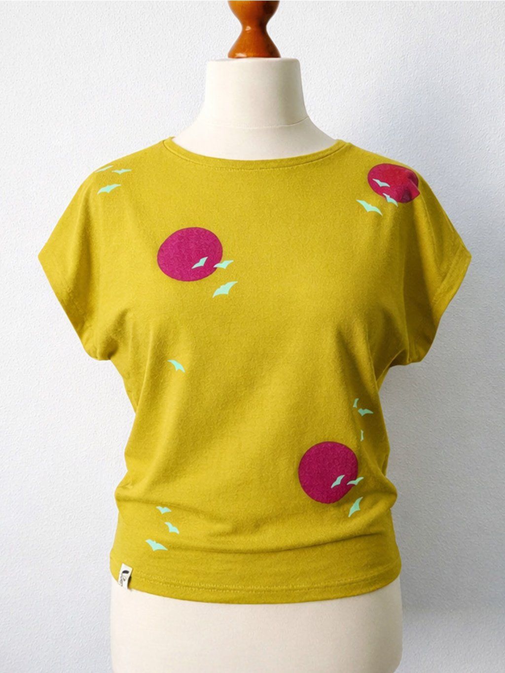 Autorský ruční potisk Maskovaní netopýři se skládá z tmavě růžových měsíců a mentolově zelených ptáčků, kteří připomínají spíš netopýry. Motivy se opakují i na zadním dílu. Linorytová razítka a předlohy si vyrábím sama a tisknu kvalitními vodouředitelnými sítotiskovými barvami, které jsou na látce měkké a jasné. Potisk má charakteristickou strukturu a vzhled razítka, není to plnobarevná plocha jako u klasického sítotisku. Každý kousek tisknu jednotlivě, takže žádné dva nebudou úplně totožné.