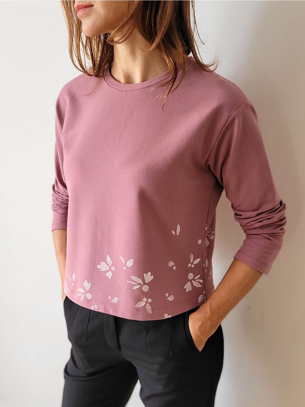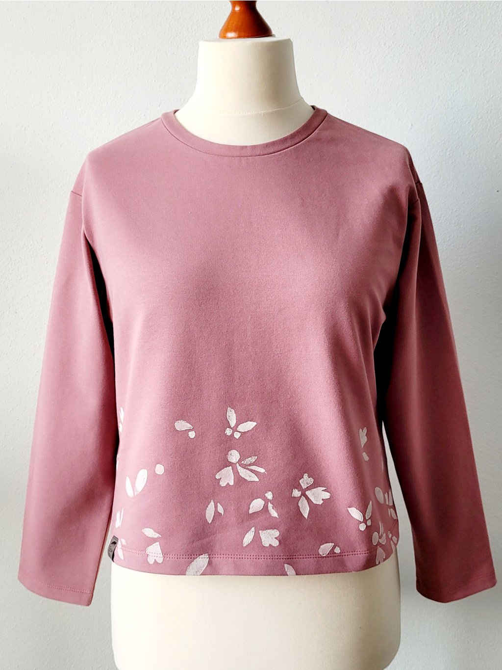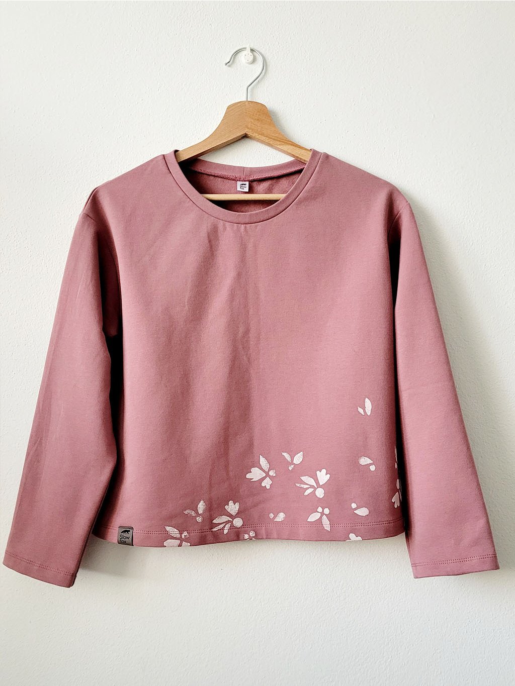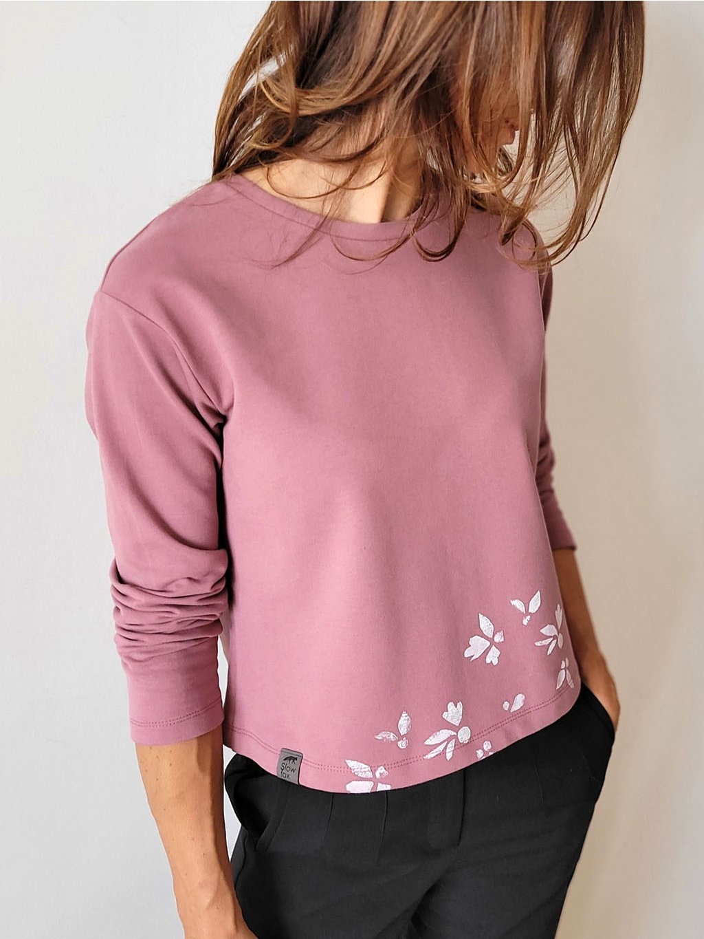 Crop mikina z úžasně příjemné a měkké počesané bio teplákoviny. S ručním autorským potiskem kvítků a lístků.