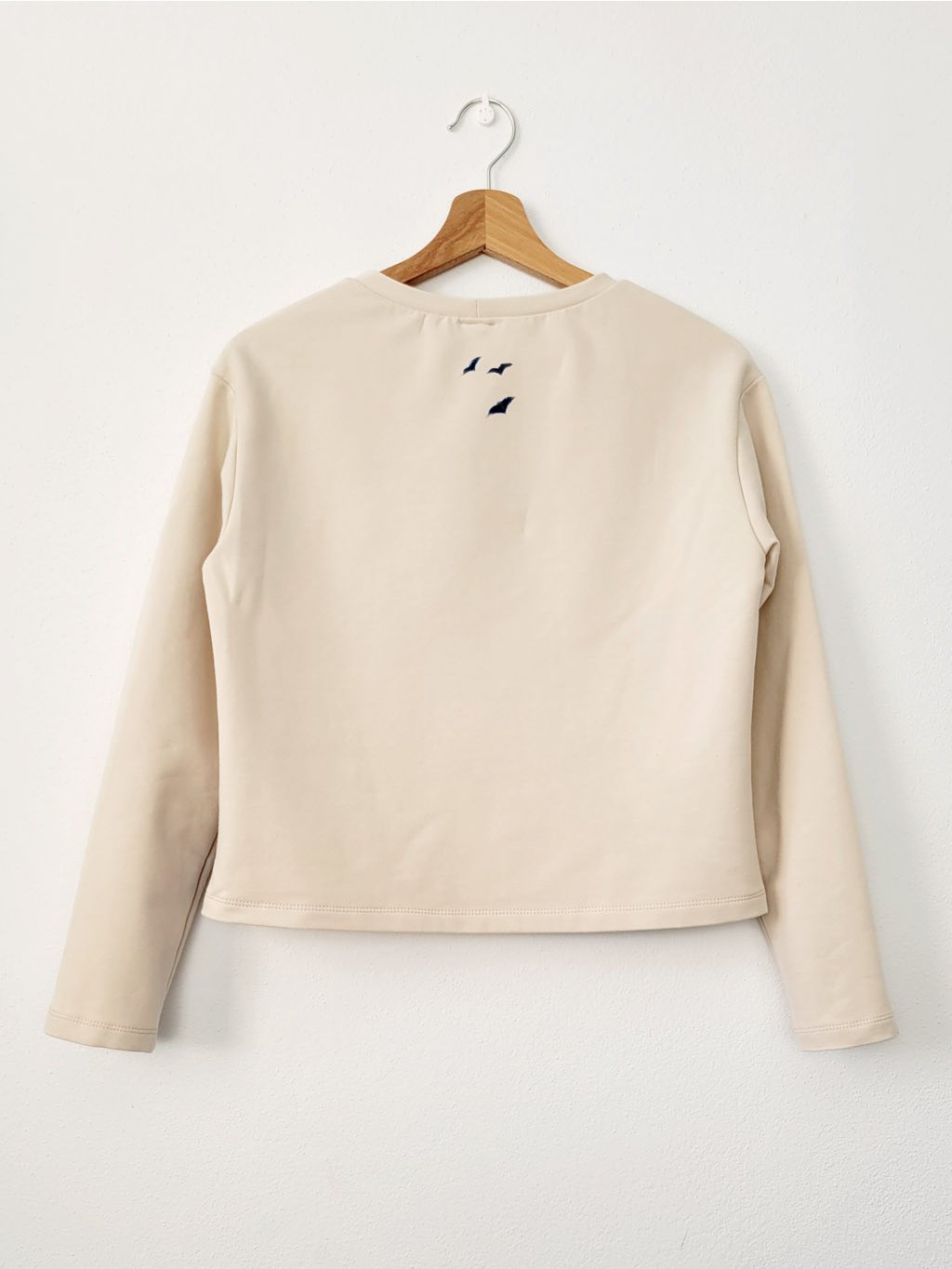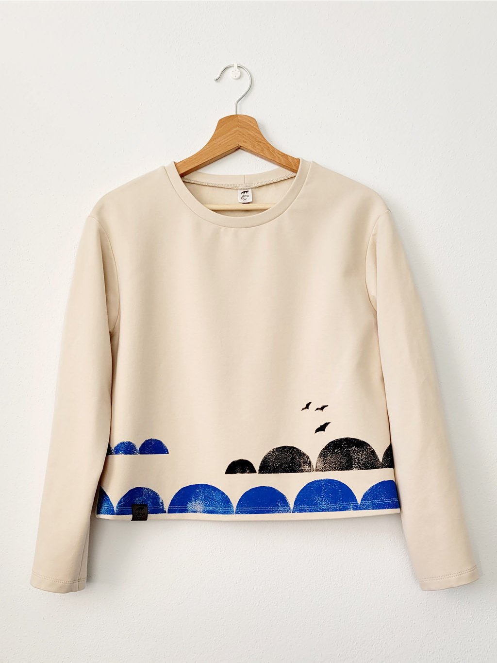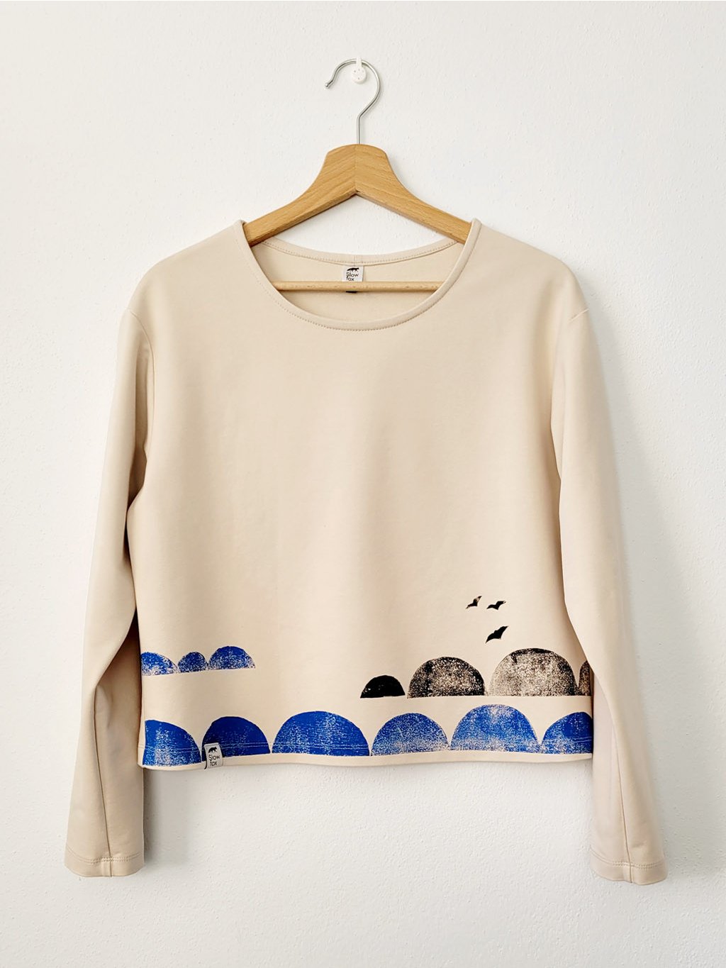 Crop mikina z úžasně příjemné a měkké počesané bio teplákoviny. S ručním autorským potiskem ptáčků letících nad krajinou.