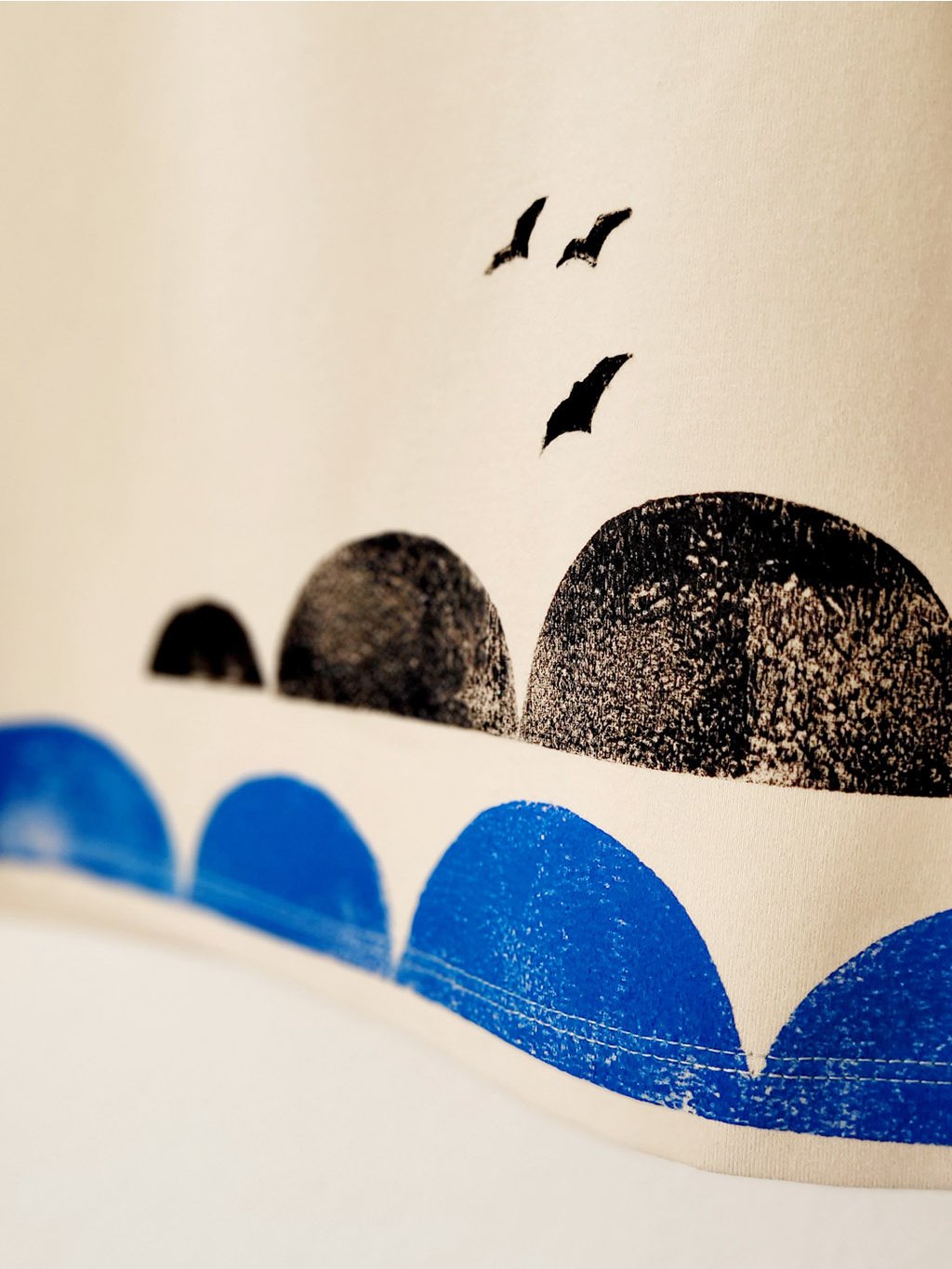 Autorský ruční potisk Přes kopečky je stylizovaná krajina v jednoduchých tvarech s letícími ptáky, v černé a modré barvě. Linorytová razítka si vyrábím sama a tisknu kvalitními vodouředitelnými sítotiskovými barvami, které jsou na látce měkké a jasné. Potisk má charakteristickou strukturu a vzhled razítka, není to plnobarevná plocha jako u klasického sítotisku.