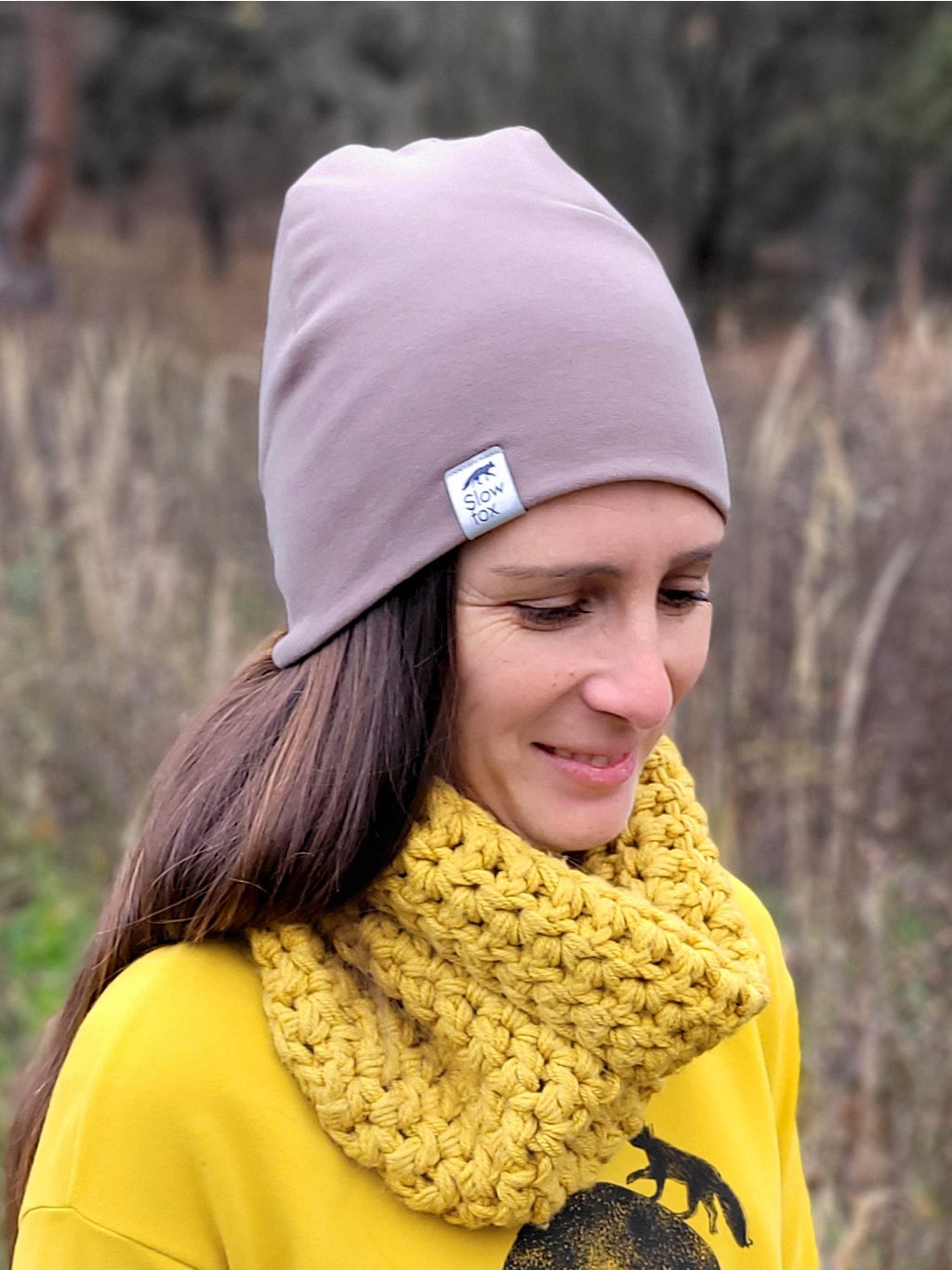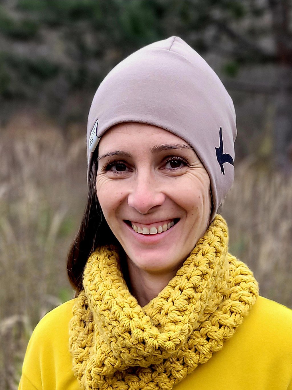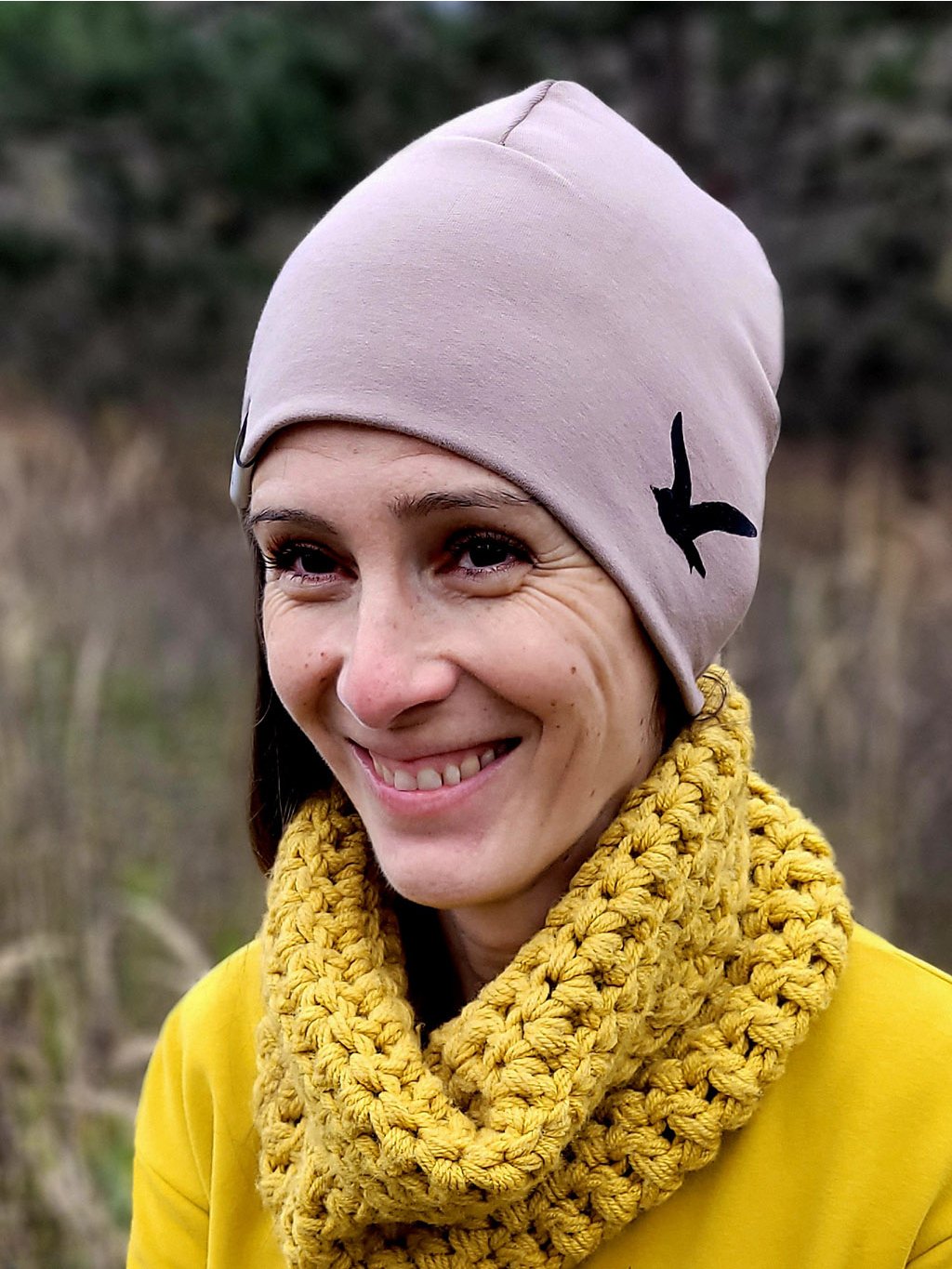 Zahřeje na jaře, na podzim i v mírné zimě. Otisk ptačí svobody vás bude provázet toulkami přírodou i městem, hodí se ke kabátu do práce i k batohu do lesa. Čepice má univerzální střih, přírodní barvu a decentní potisk, takže se bude hodit k většině outfitů.