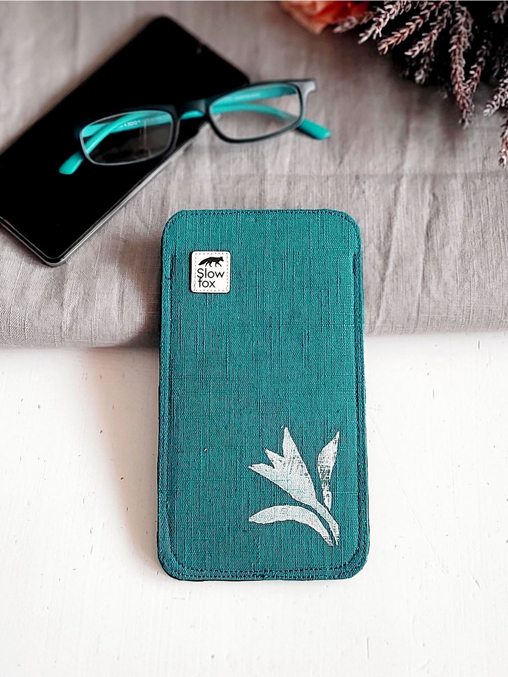 Lněné pouzdro na telefon/brýle - KVĚT, smaragdové