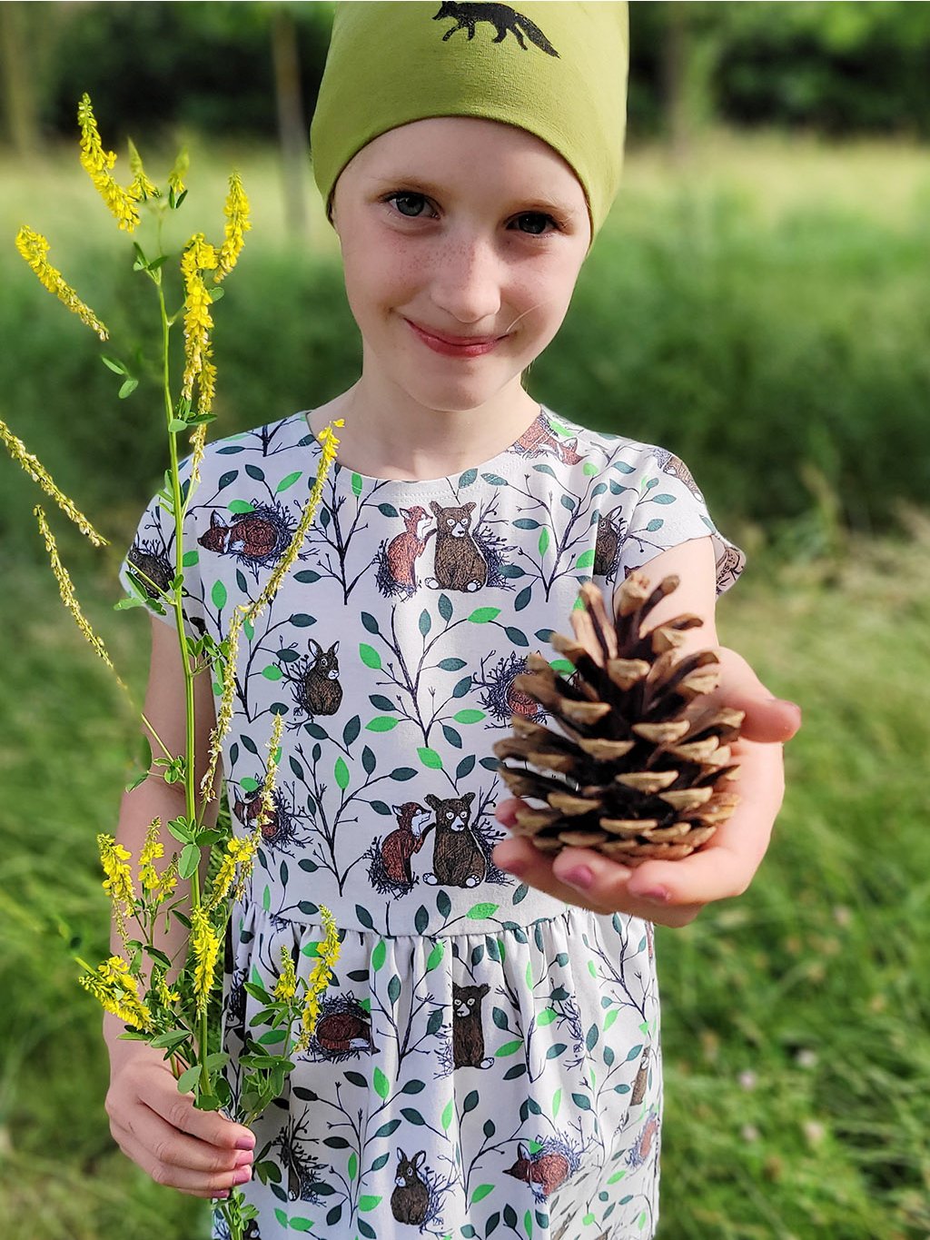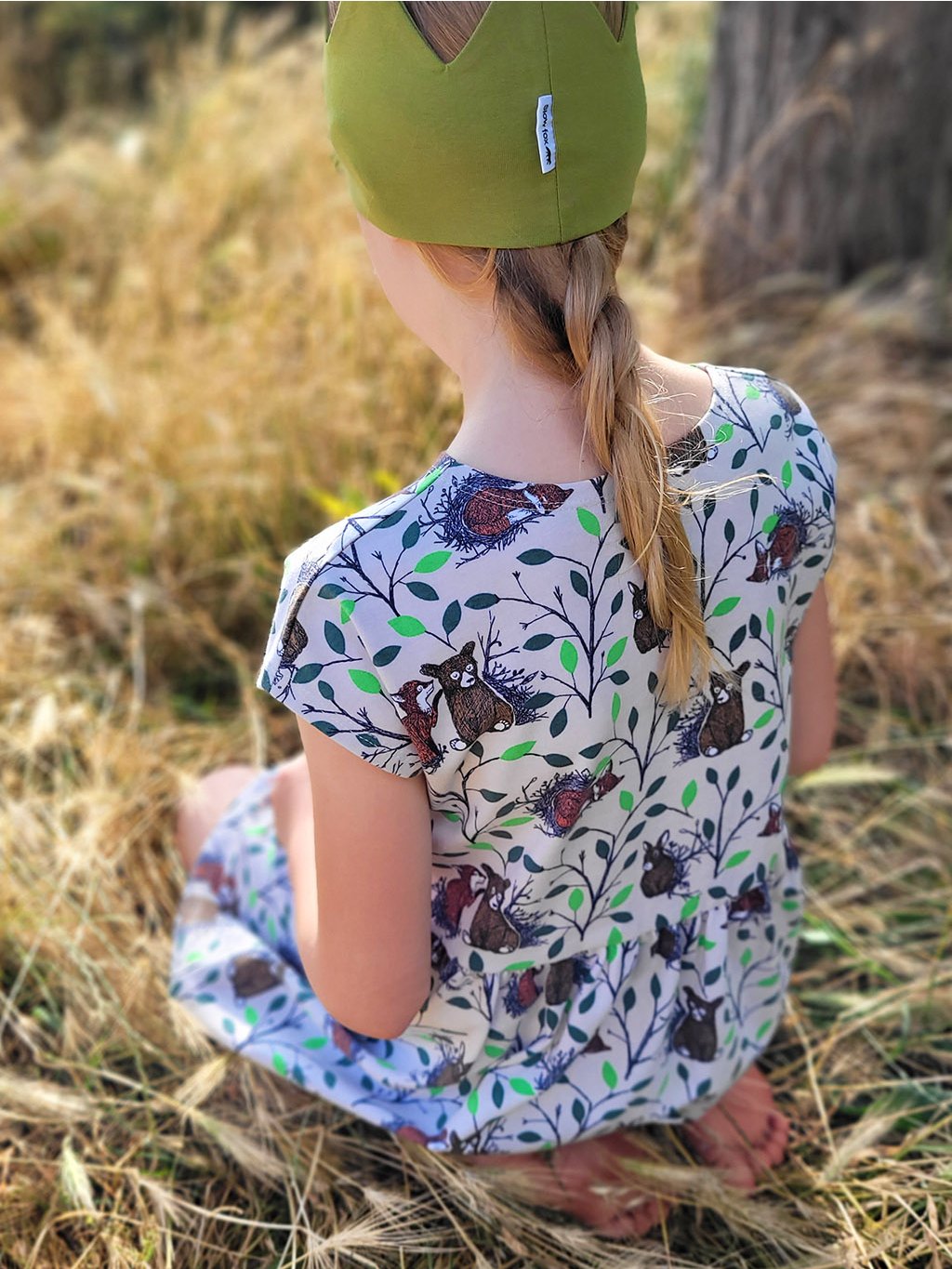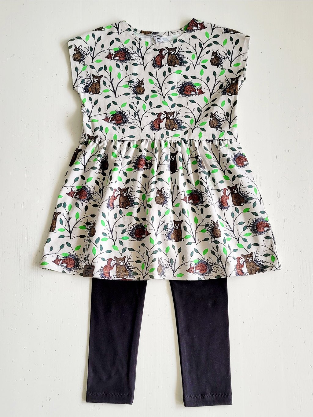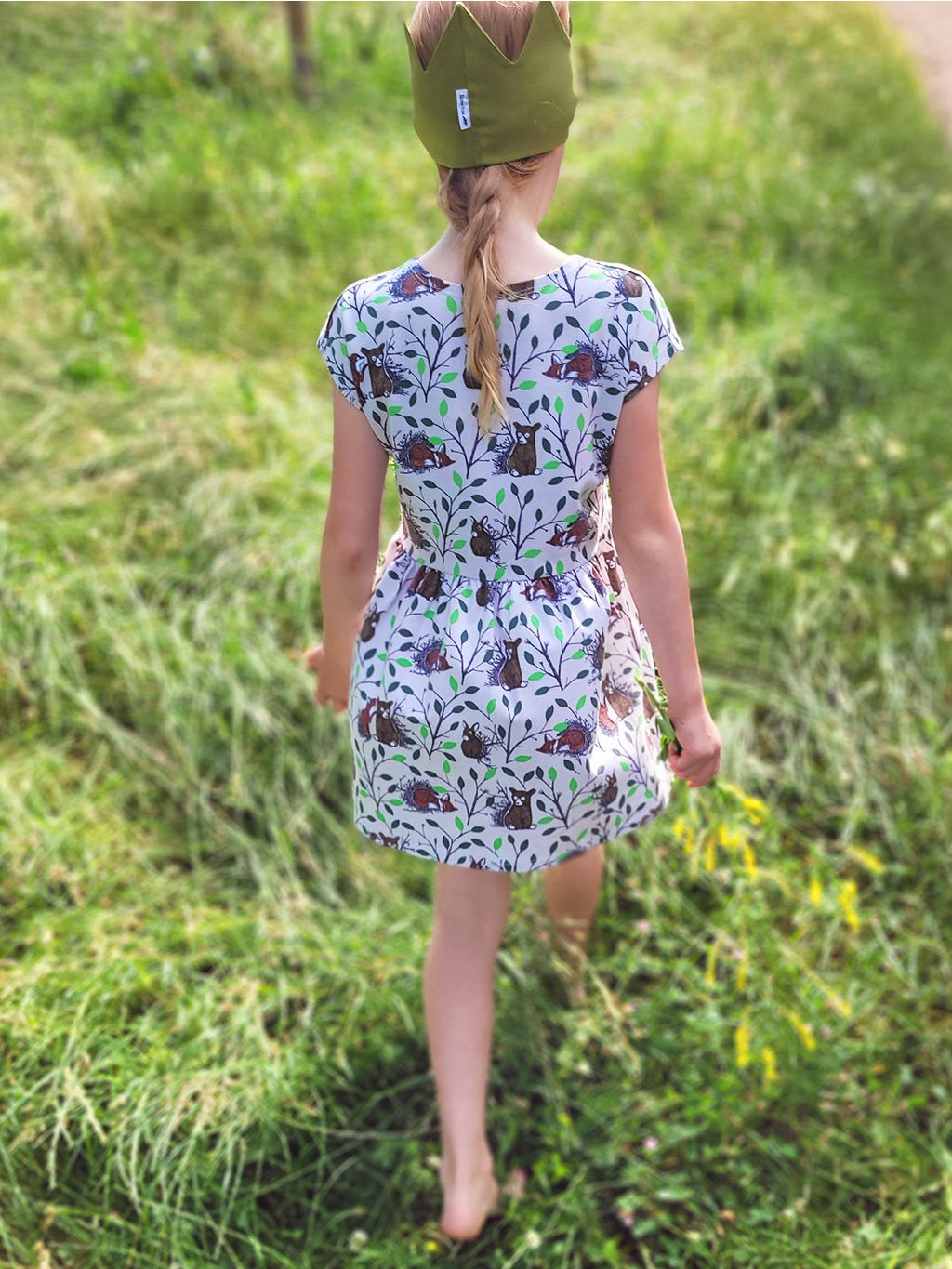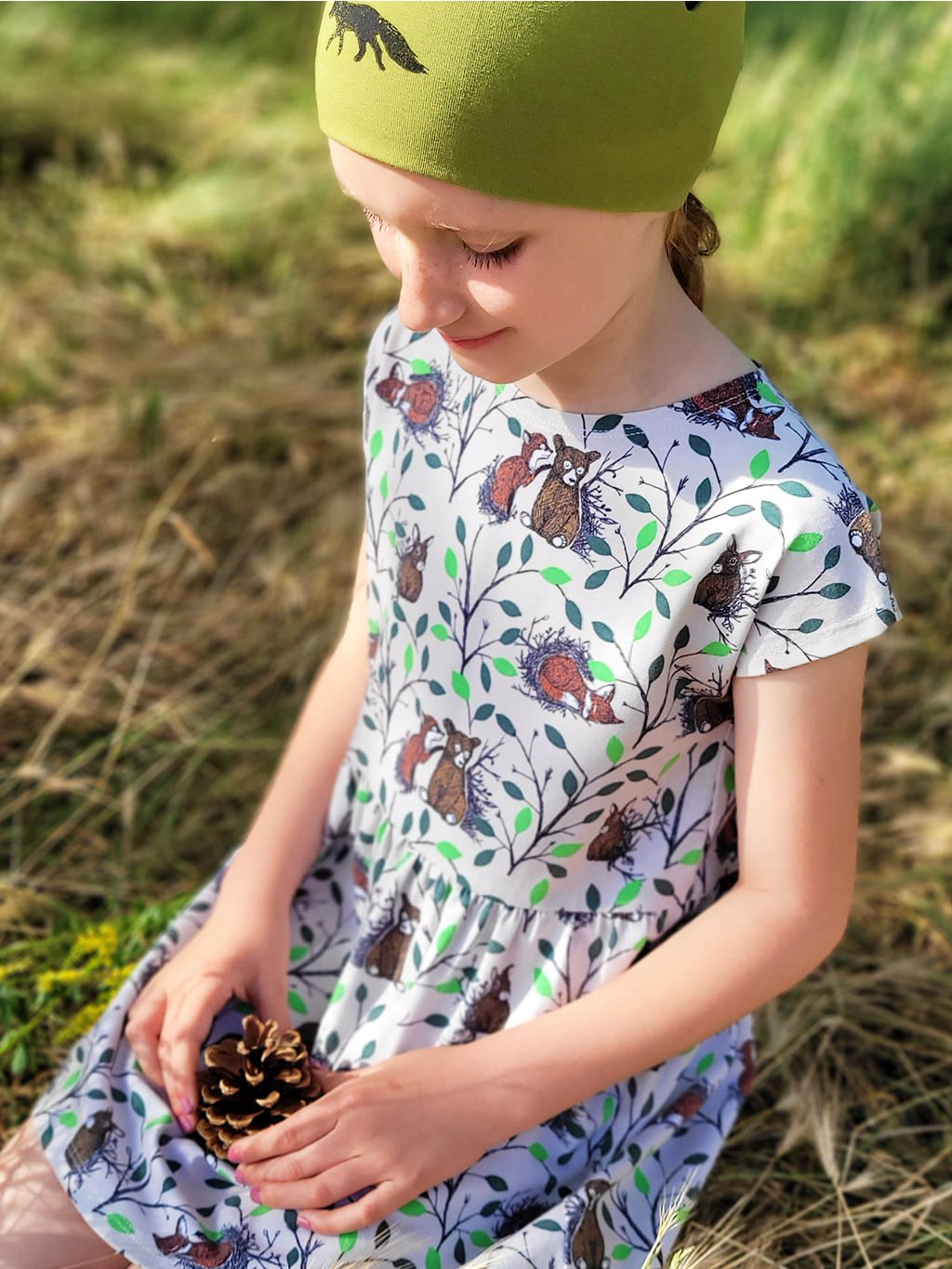 Příjemné a pohodlné úpletové šatičky s krásným potiskem. Vzor Lesní zvířátka pochází od finské značky Paapii, která je známá svou vysokou kvalitou látek. Tisk je jasný, ostrý, barvy syté a neoperou se ani po mnoha vypráních. Šaty se dají nosit samostatně i jako tunika přes legíny. Střih je spíše volnější a materiál pružný.