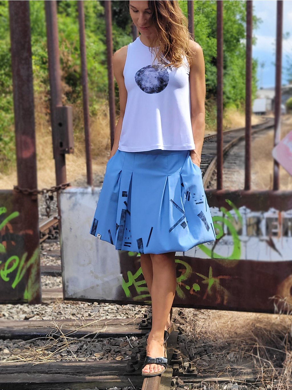 Jednoduchý, ale promyšlený střih, který sluší každé postavě a ruční potisk dělá z této sukně superpohodlný a zároveň originální kousek. Částečně sešité sklady se rozevírají až na bocích, takže vykouzlí ženskou siluetu a zakryjí to co chceme zakrýt... :-)