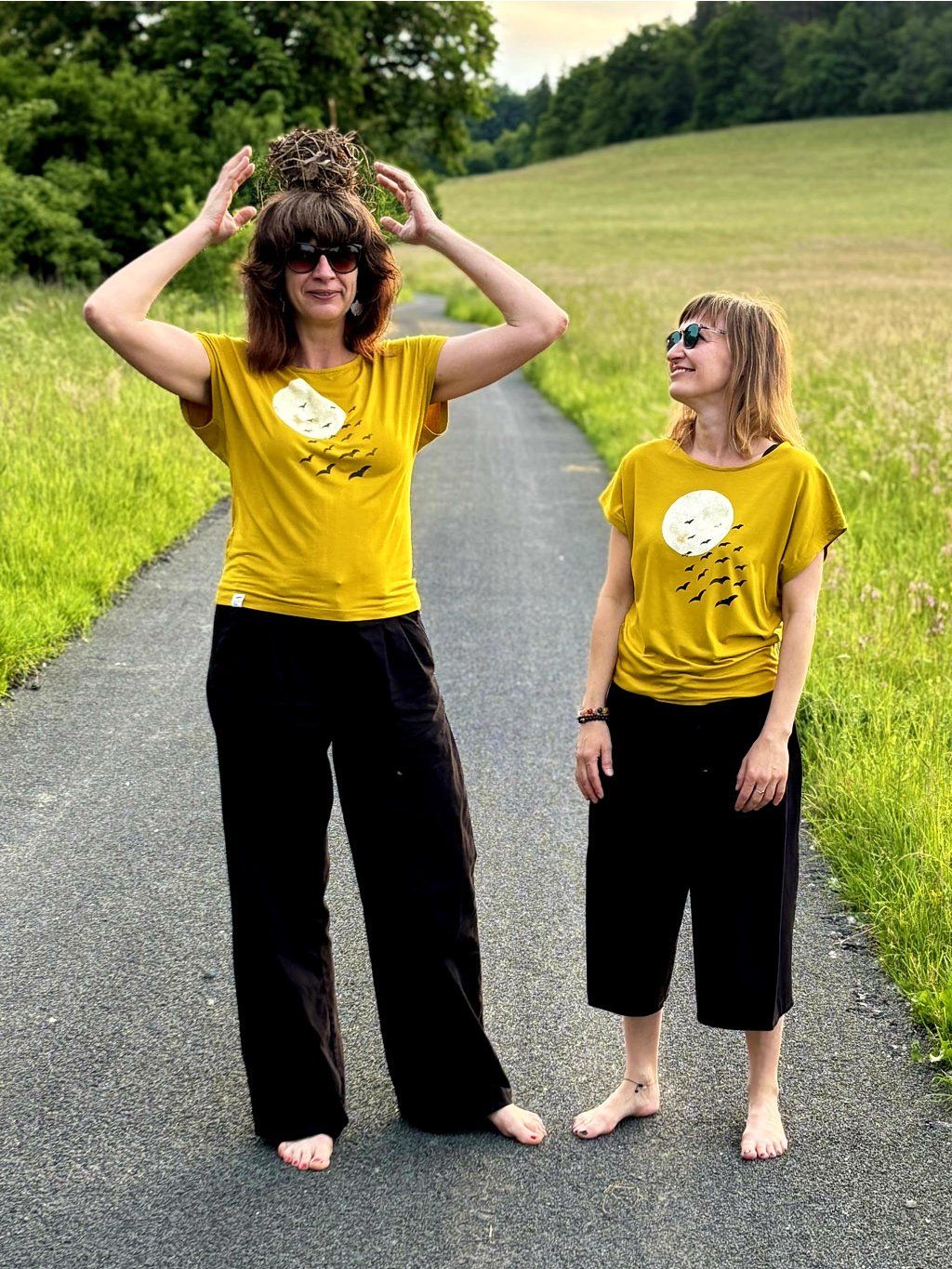 Tato kombinace barvy látky a potisku ještě neexistuje fyzicky, první fotku vytvořila moje uměle-inteligentní kamarádka, ale všechny nabízené varianty jsem si předem zkušebně natiskla, abych si ověřila, že fungují a vypadají spolu dobře. Na ostatních fotkách je tričko s jiným potiskem na reálných ženách.