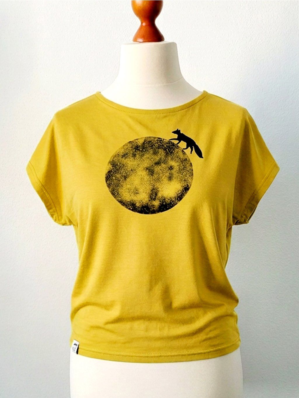 Autorský ruční potisk Fox on the Moon se skládá z černého tisku Měsíce a lišky. Na zadním díle pod krkem je malý otisk First Fox on the Moon. Linorytová razítka a předlohy si vyrábím sama a tisknu kvalitními vodouředitelnými sítotiskovými barvami, které jsou na látce měkké a jasné. Potisk má charakteristickou strukturu a vzhled razítka, není to plnobarevná plocha jako u klasického sítotisku. Každý kousek tisknu jednotlivě, takže žádné dva nebudou úplně totožné.