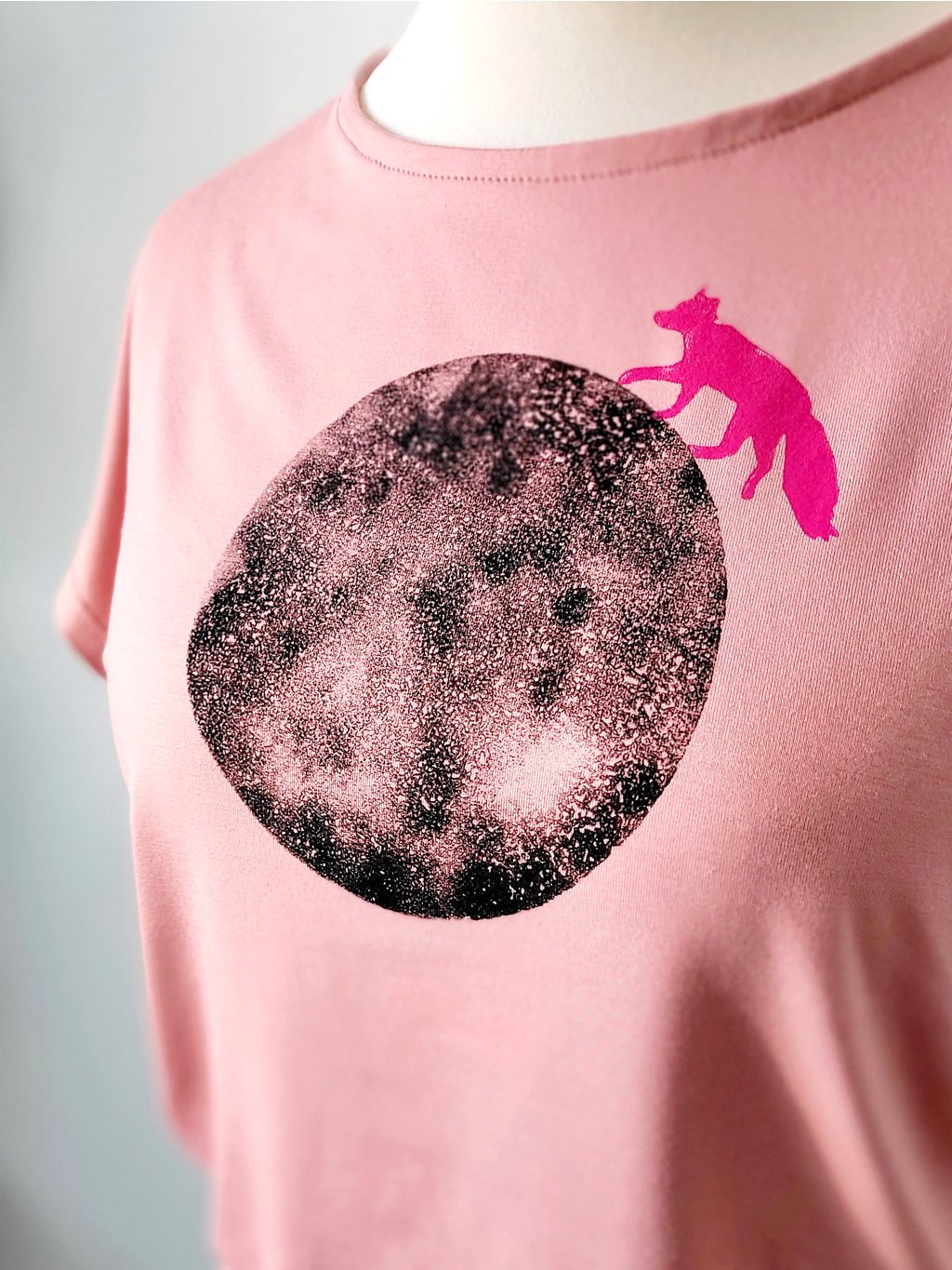 Autorský ruční potisk Fox on the Moon se skládá z černého tisku Měsíce a výrazně růžové lišky. Na zadním díle je malý otisk First Fox on the Moon. Linorytová razítka a předlohy si vyrábím sama a tisknu kvalitními vodouředitelnými sítotiskovými barvami, které jsou na látce měkké a jasné. Potisk má charakteristickou strukturu a vzhled razítka, není to plnobarevná plocha jako u klasického sítotisku. Každý kousek tisknu jednotlivě, takže žádné dva nebudou úplně totožné.